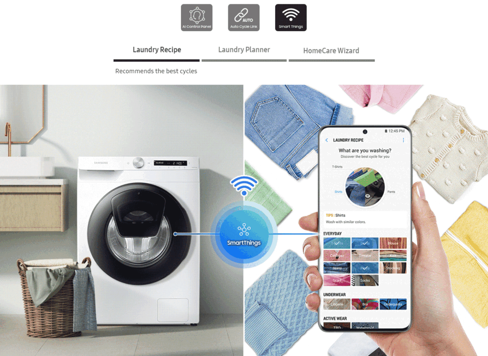 Wie wil niet slimmer wassen. Deze wasmachine heeft een AI-software ingebouwd. Die leert en je ondersteund bij het wassen. De AI maakt onthoudt dan ook je wasgedrag, geeft tips, als ook statusupdate. Via een app “de SmartThings-app”. Deze app kun je installeren op Android of Apple-telefoon.